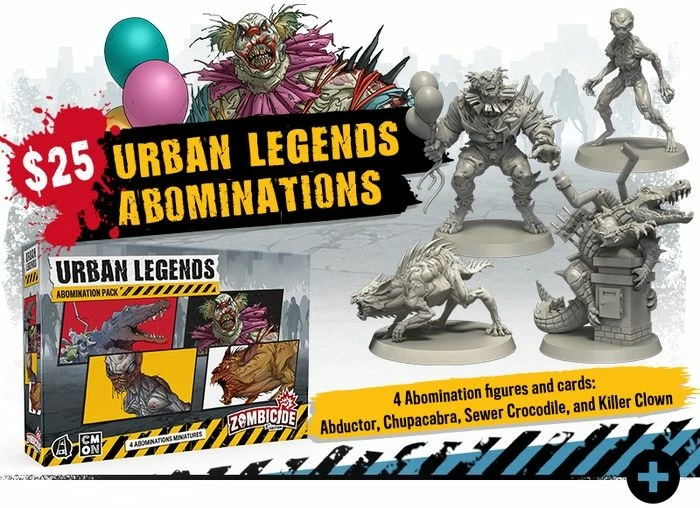 The Urban Legends Abominations pack brings 4 different Abominations and their cards. The Killer Clown, Chupacabra, Sewer Crocodile, and Abductor. You’ve heard of them. You feared them. And now, it is time to fight them!