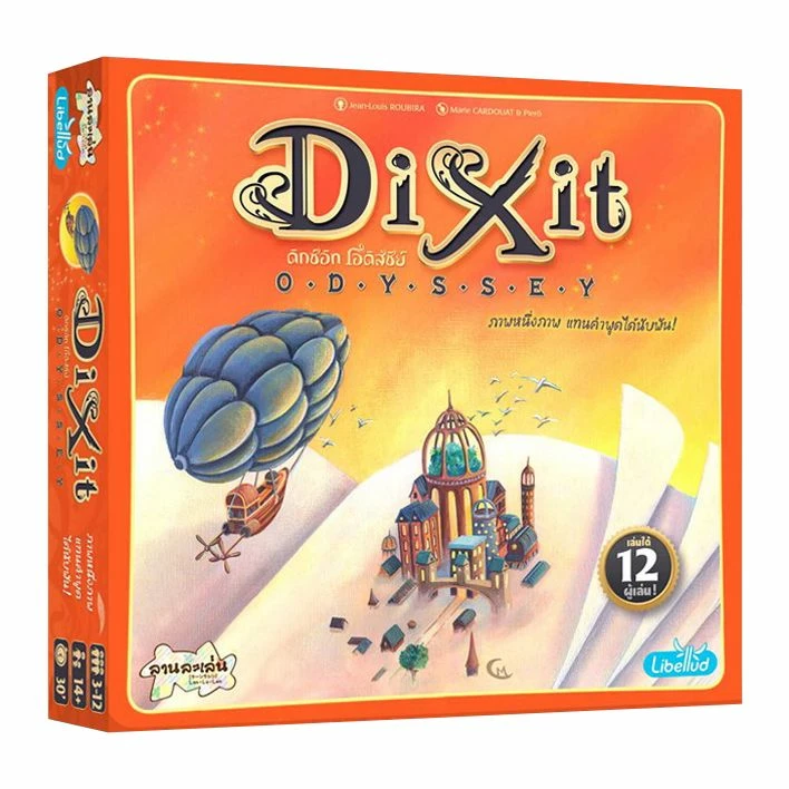 Dixit Odyssey contains 84 new cards, each with a unique image drawn by Pierô and colored by Marie Cardouat, artist of Dixit and Dixit 2. The stand alone version also includes a folding game board, 6 new rabbit scoring tokens (12 total), and a box large enough to hold all the Dixit cards released to date. The stand alone version of Dixit Odyssey includes enough components for up to twelve players and also has variant rules for team play and for new ways to play with the cards.