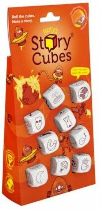 Originally Rory had put the images on the faces of a Rubik’s Cube, and players would turn the Cube to scramble the images, then choose one side to play with. Kate Jones of Kadon Enterprises suggested putting the 54 images on 9 separate cubes, to allow for quicker ways to generate more varied combinations, including conceptual puzzles. Rory readily agreed, having considered the 9-cubes idea himself earlier. At a creativity conference held at Kadon headquarters in May 2004, a prototype was whipped up, and in 2005 Kadon launched the cubes version of Rory’s Story Cubes.