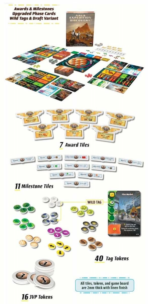 Terraforming Mars Ares Expedition: Discovery adds four new mechanics to base Ares Expedition: awards, milestones, upgraded phase cards, and wild tags.