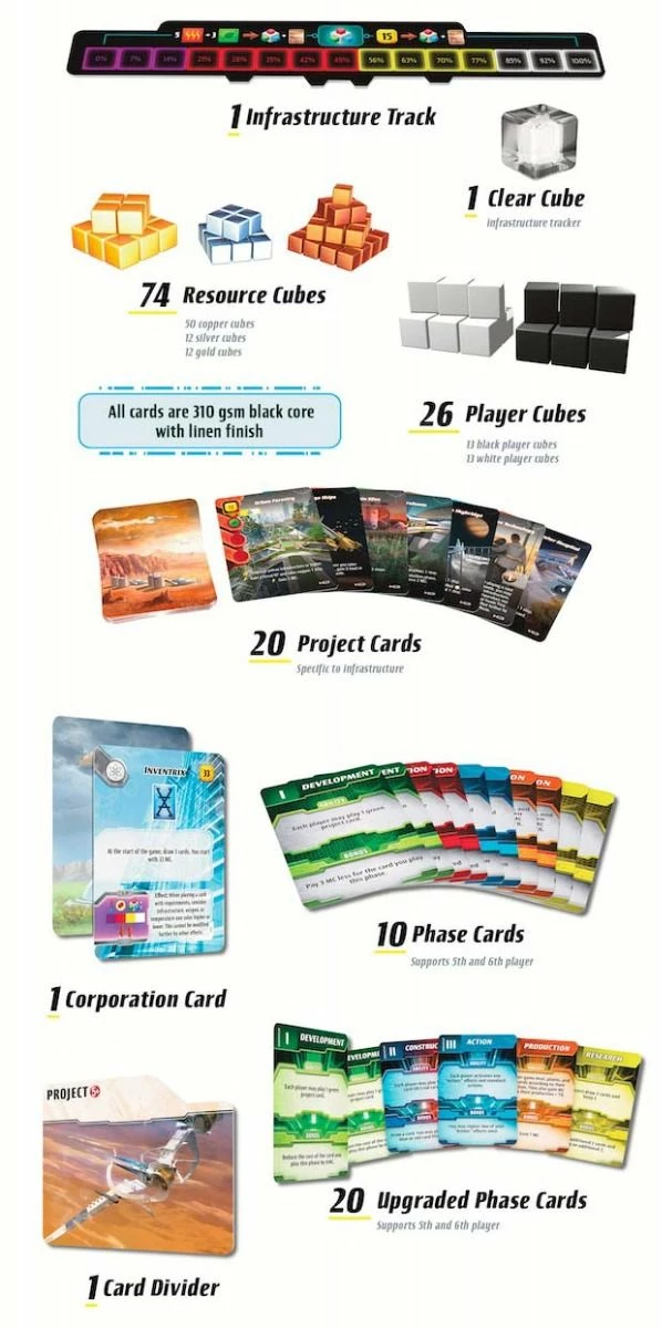 Ares Expedition: Foundations contains additional player boards, cubes, and phase cards so that Ares Expedition can be played with up to six players. This expansion also includes two additional game boards. One is a larger score track. The other adds a fourth terraforming metric: infrastructure.