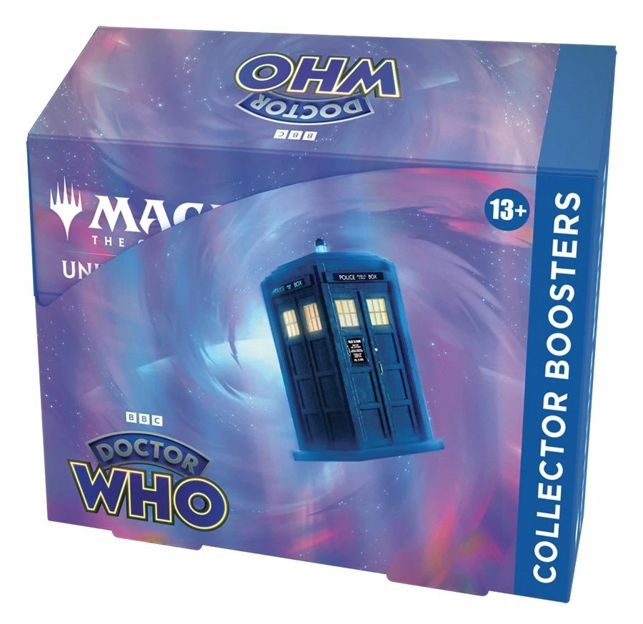 The Universes Beyond: Doctor Who™ Collector Booster Box contains 12 Universes Beyond: Doctor Who™ Collector Boosters. Each Collector Booster contains 15 Magic: The Gathering cards and 1 Traditional Foil double-sided token, with a combination of 7-14 cards of rarity Rare or higher and up to 7 Uncommon, 5 Common, and 1 Land cards. Every pack contains a total of 12 Foil cards.