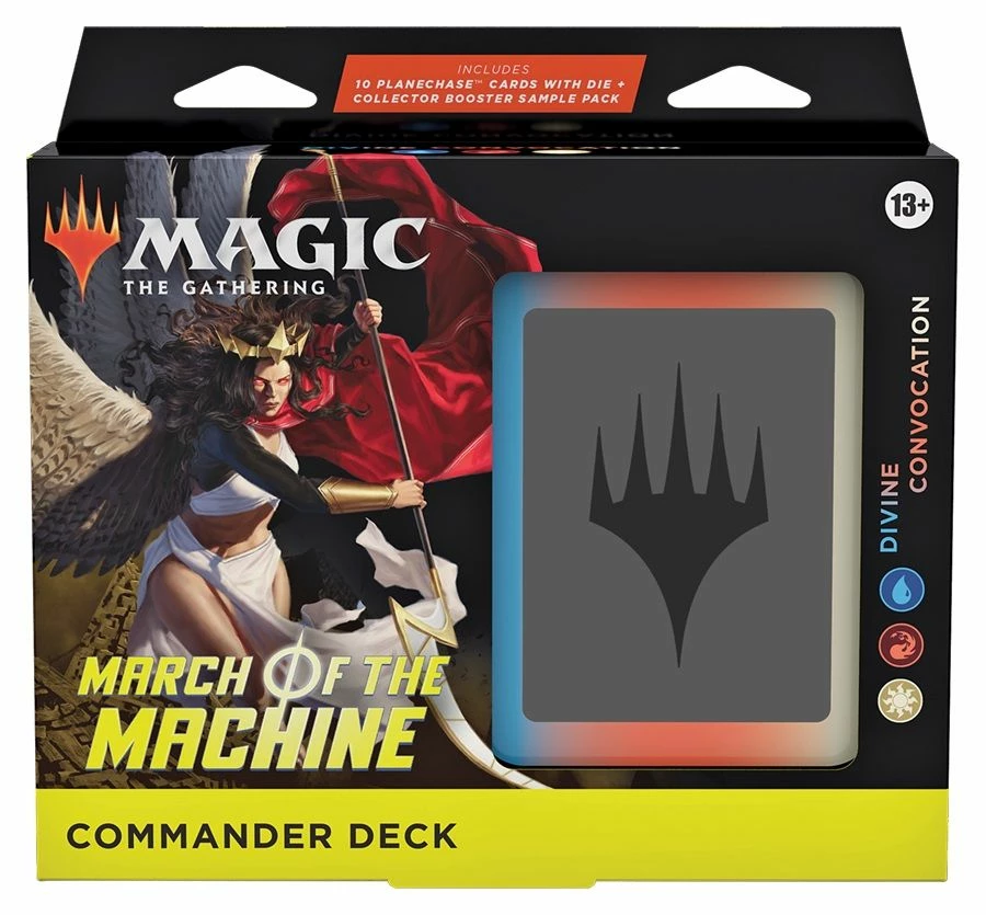 - Divine Convocation (Blue-Red-White deck)—100-card ready-to-play March of the Machine Commander Deck with 2 Traditional Foil Legendary cards and 98 nonfoil cards