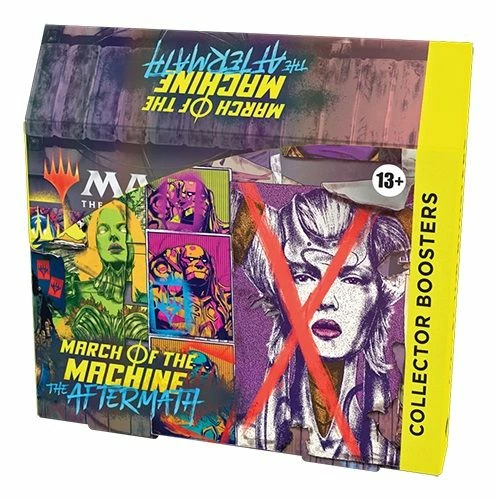 The March of the Machine: The Aftermath Collector Booster Box contains 12 March of the Machine: The Aftermath Collector Boosters. Each Collector Booster contains 6 Magic: The Gathering cards and 1 Traditional Foil double-sided token, with 4 cards of rarity Rare or higher and 2 Uncommon cards. Every pack contains a total of 5–6 foil cards.
