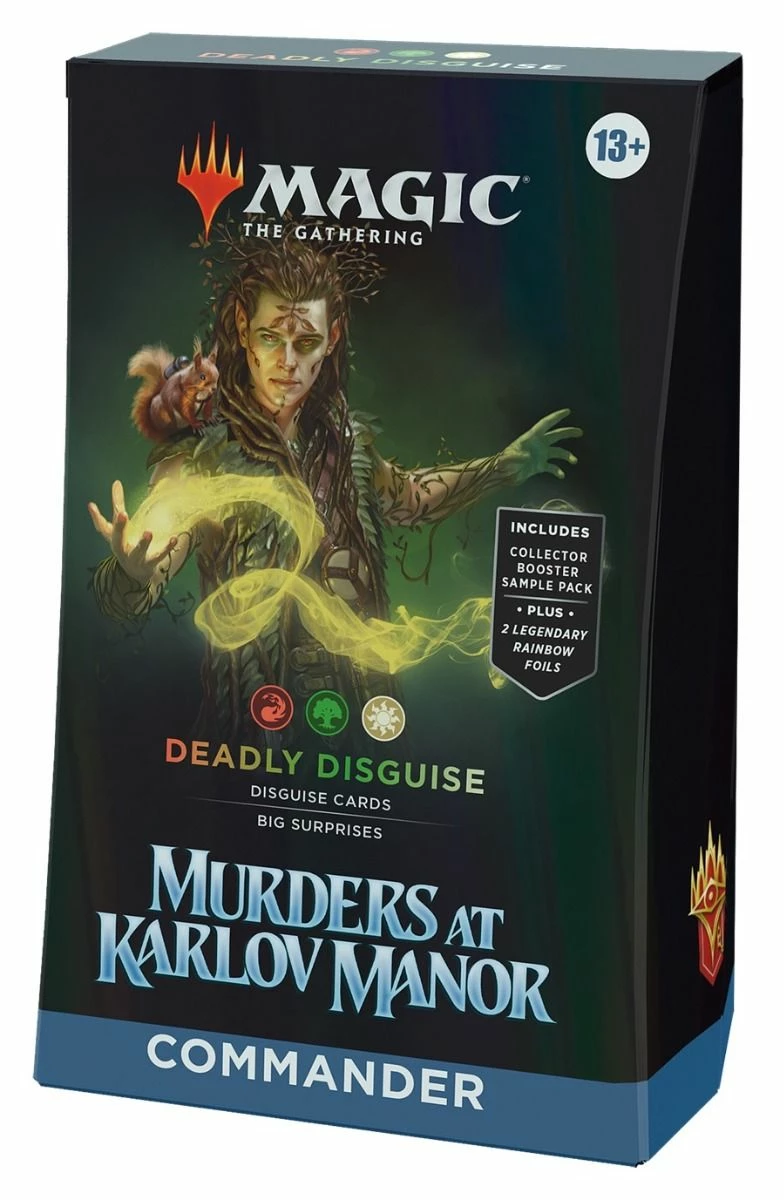 - CONTENTS—1 ready-to-play Deadly Disguise Murders at Karlov Manor Commander Deck, a 2-card Collector Booster Sample Pack, 1 Foil-Etched Display Commander, 10 double-sided tokens, 1 life tracker, and 1 deck box