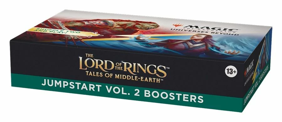 The Lord of the Rings: Tales of Middle-earth Jumpstart Vol. 2 Booster Box contains 18 The Lord of the Rings: Tales of Middle-earth Jumpstart Vol. 2 Boosters. Each booster has a theme. Just grab two packs and shuffle them together for wild combos and a unique gameplay experience that’s great for a quick game, for long-time fans looking to jump back in, or for a fun way to learn to play. Each The Lord of the Rings: Tales of Middle-earth Jumpstart Vol. 2 Booster contain 20 Magic cards (including all the lands you need to play). In every pack, you’ll find 2 Rare cards (1 Rare card designed for Jumpstart boosters and 1 Rare or Mythic Rare from the main set), and 2 Land cards with a shining Traditional Foil treatment. This product does not contain Serialized Ring cards, including the Serialized Elven, Dwarven, or Human Sol Ring cards, and The 1 of 1 Ring (Serialized 001 of 001). Serialized Elven, Dwarven, and Human Sol Ring cards can only be found in some The Lord of the Rings: Tales of Middle-earth Collector Boosters. Only one card has been printed of The One Ring (Serialized 001 of 001), and this card can only be found in one English-Language Collector Booster. Non-serialized Ring cards are mechanically identical to their Serialized versions. If you’re looking to maximize your mashups, The Lord of the Rings: Tales of Middle-earth Jumpstart Vol. 2 Boosters can be combined with packs from any other Jumpstart product.