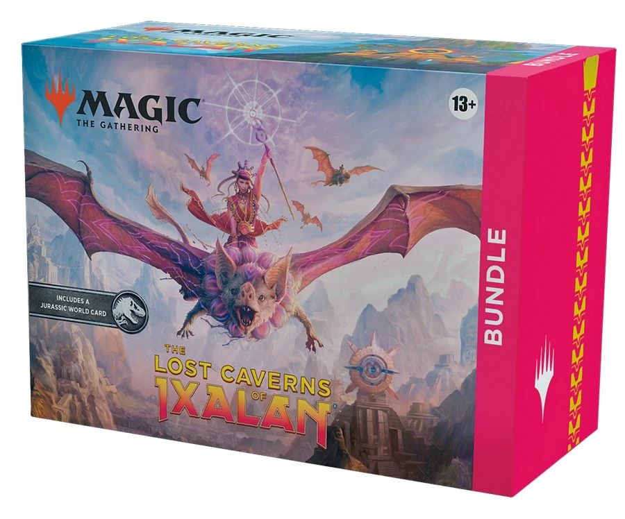 Explore the cavernous depths beneath Ixalan in a race to the hidden core. Will you uncover treasure and glory, or will your adventure spell certain doom? The Lost Caverns of Ixalan Bundle contains 8 The Lost Caverns of Ixalan Set Boosters—the best boosters to open just for fun—plus 1 Universes Beyond Jurassic World Collection card, 1 Traditional Foil card with Bundle-exclusive alternate-art, 40 Basic Land cards (20 Traditional Foils and 20 nonfoils), 1 oversized Spindown life counter, 1 card storage box, and 2 reference cards.