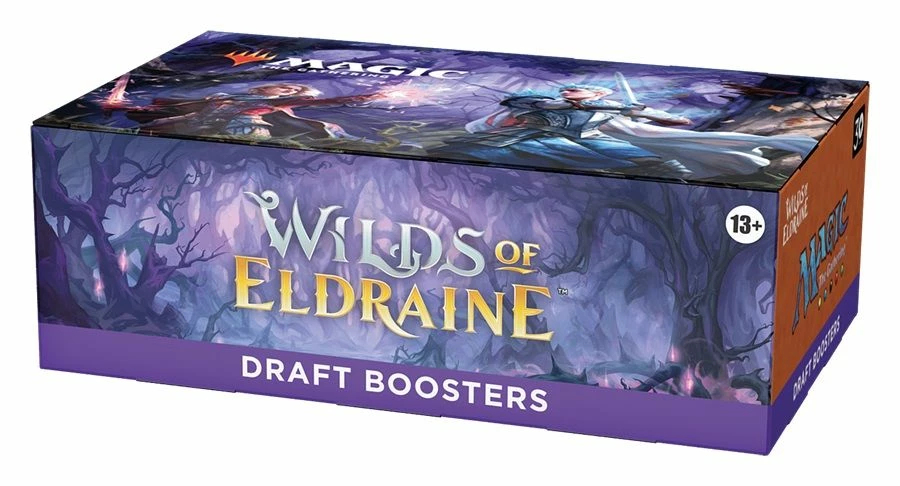 Your next adventure awaits! This Wilds of Eldraine Draft Booster Box contains 36 Wilds of Eldraine Draft Boosters. Each Draft Booster contains 15 cards and 1 token/ad card, including 1–2 cards of rarity Rare or higher, 3–4 Uncommon, 9 Common, and 1 Land cards (Full-Art Land in 33% of boosters). Every pack contains at least 1 special Borderless card of rarity Uncommon or higher and a Traditional Foil card of any rarity replaces a Common in 33% of boosters.