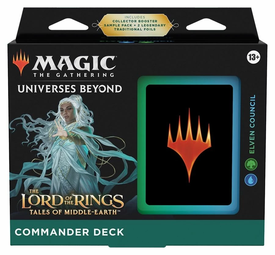 The Lord of the Rings: Tales of Middle-earth Elven Council Commander Deck set includes 1 ready-to-play Green-Blue deck of 100 Magic cards (2 Traditional Foil Legendary Creature cards, 98 nonfoil cards), a 2-card Collector Booster Sample Pack (contains 1 Traditional Foil or nonfoil special treatment card of rarity Rare or higher and 1 Traditional Foil special treatment Common or Uncommon card), 1 foil-etched Display Commander (a thick cardstock copy of the commander card with foil etched into the card’s border and art), 10 double-sided tokens, 1 Helper card, 1 deck box (can hold 100 sleeved cards), 1 Life Wheel, 1 strategy insert, and 1 reference card.Â